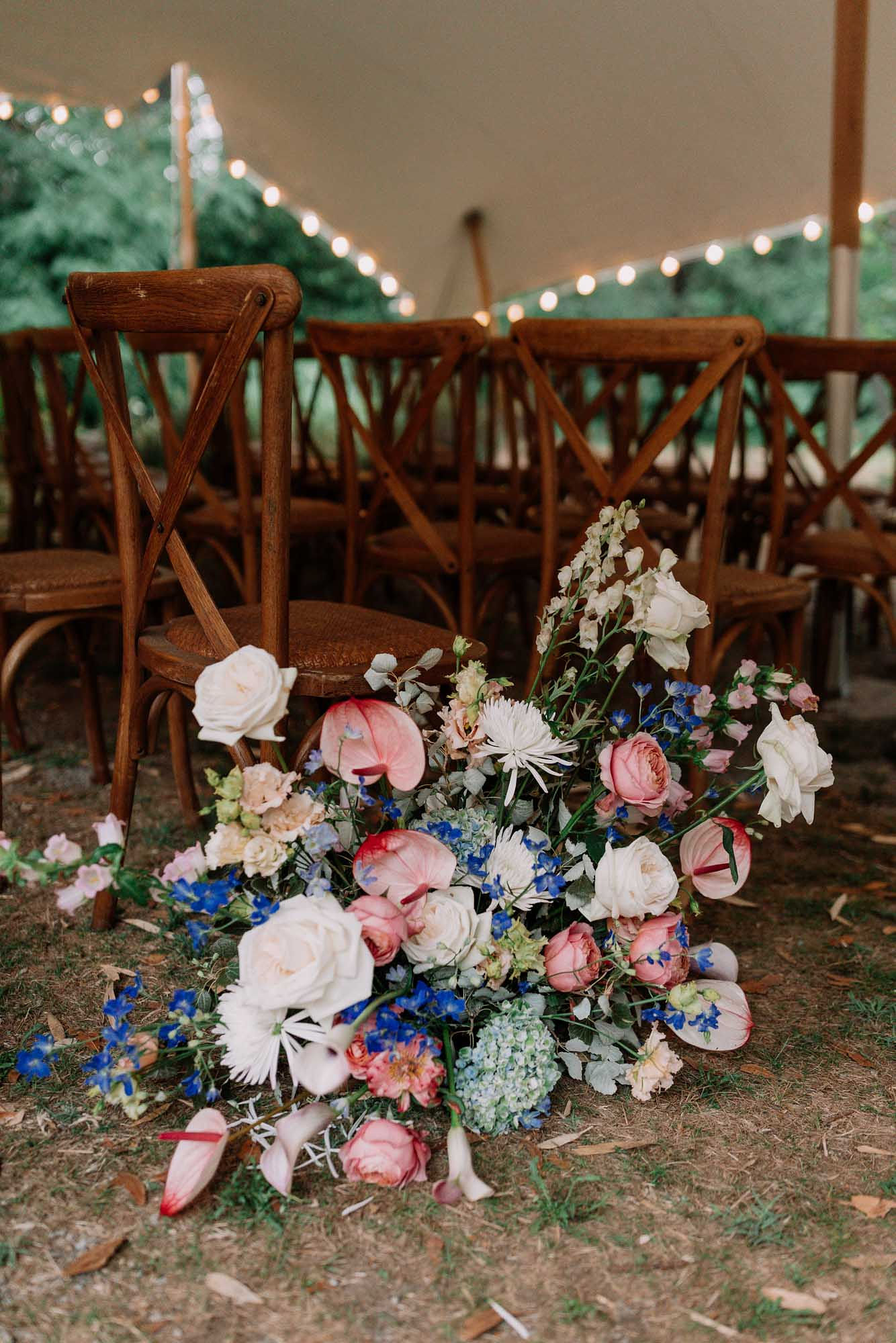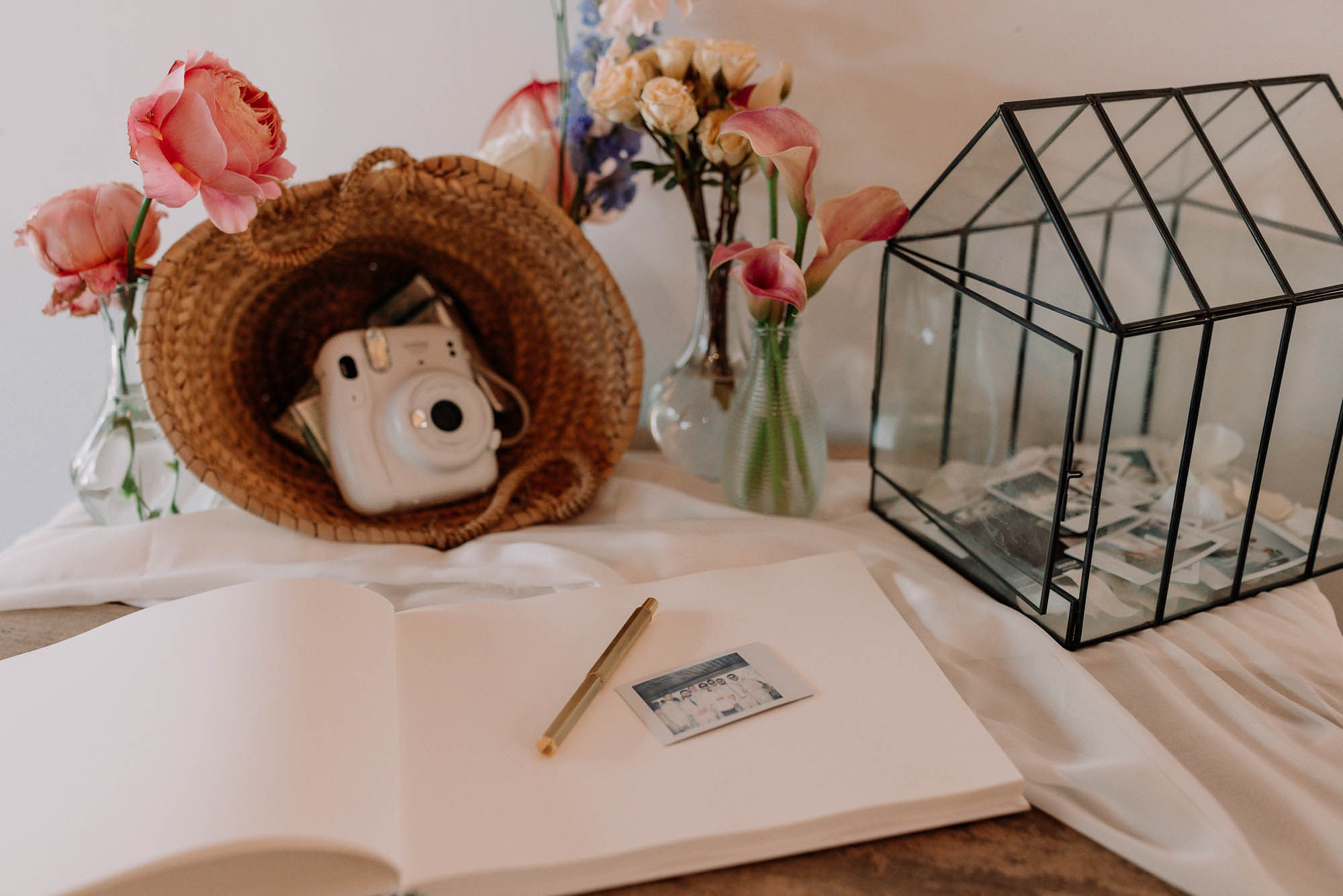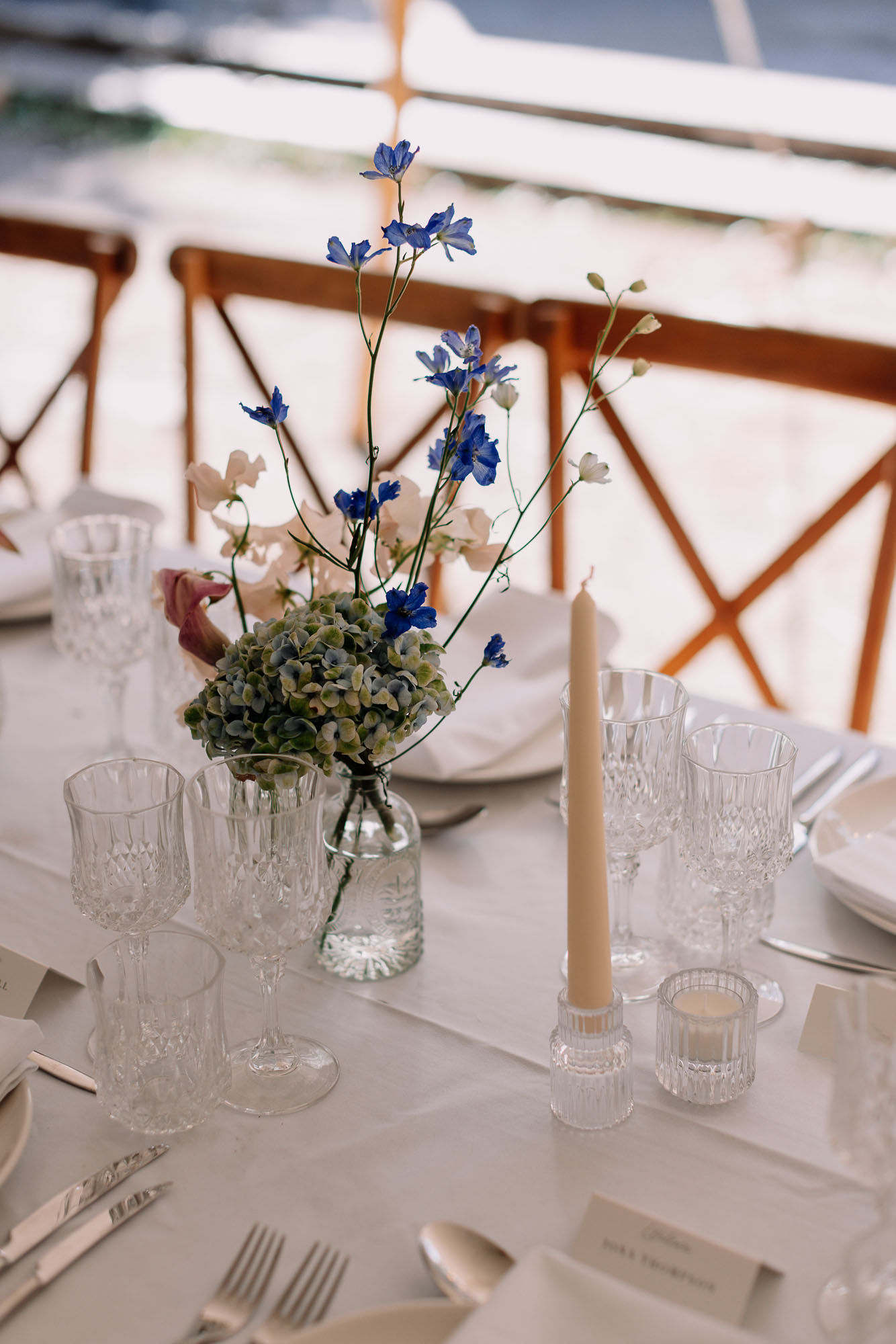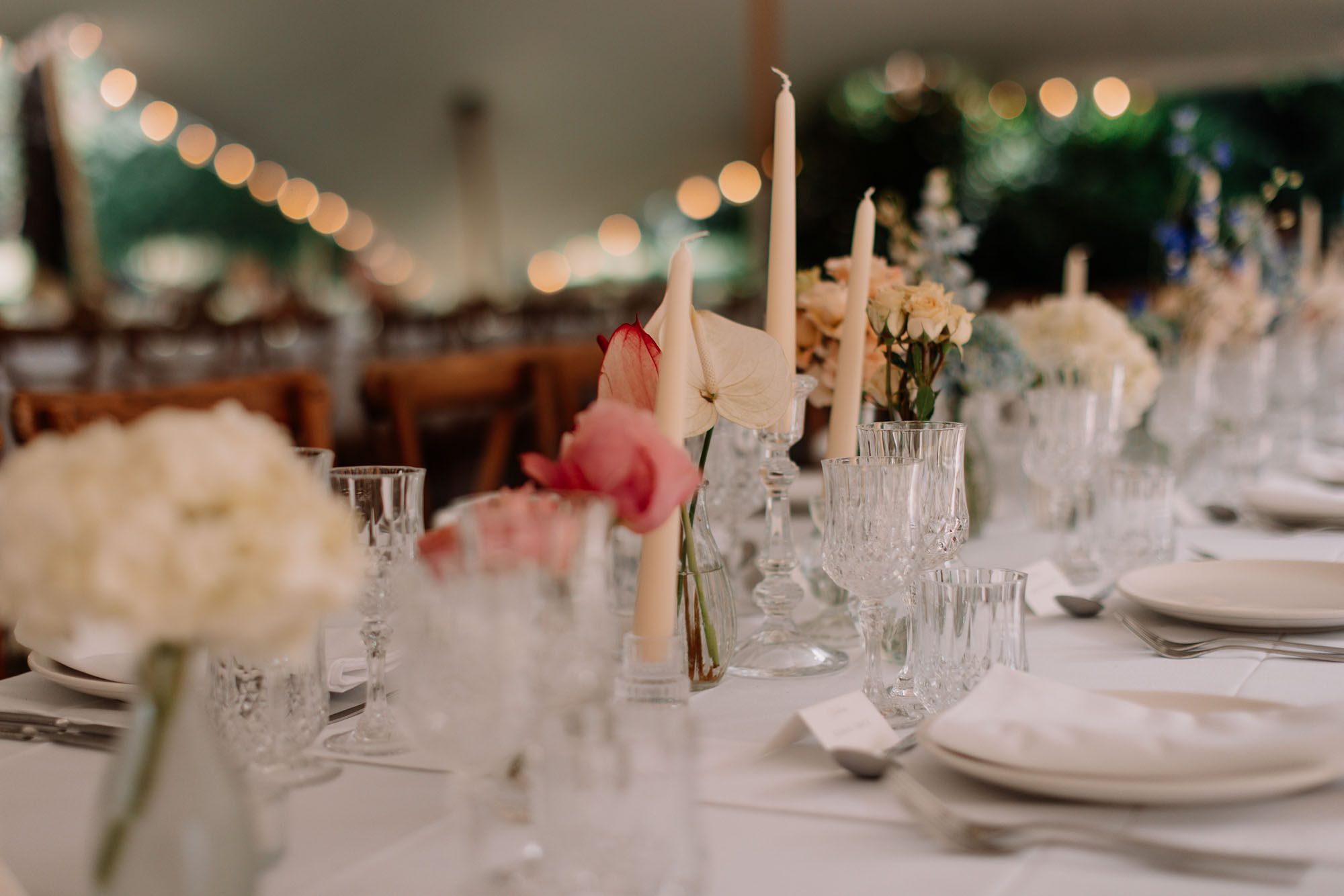 fleuriste Mon Soleil Rose, des fleurs locales et de saison. Les couleurs pastels des compositions florales apportaient la touche romantique au décor. Accumulation de petits vases vintage sur les tables, composition dans l’allée de la cérémonie… Dans une ambiance intimiste, le mobilier de