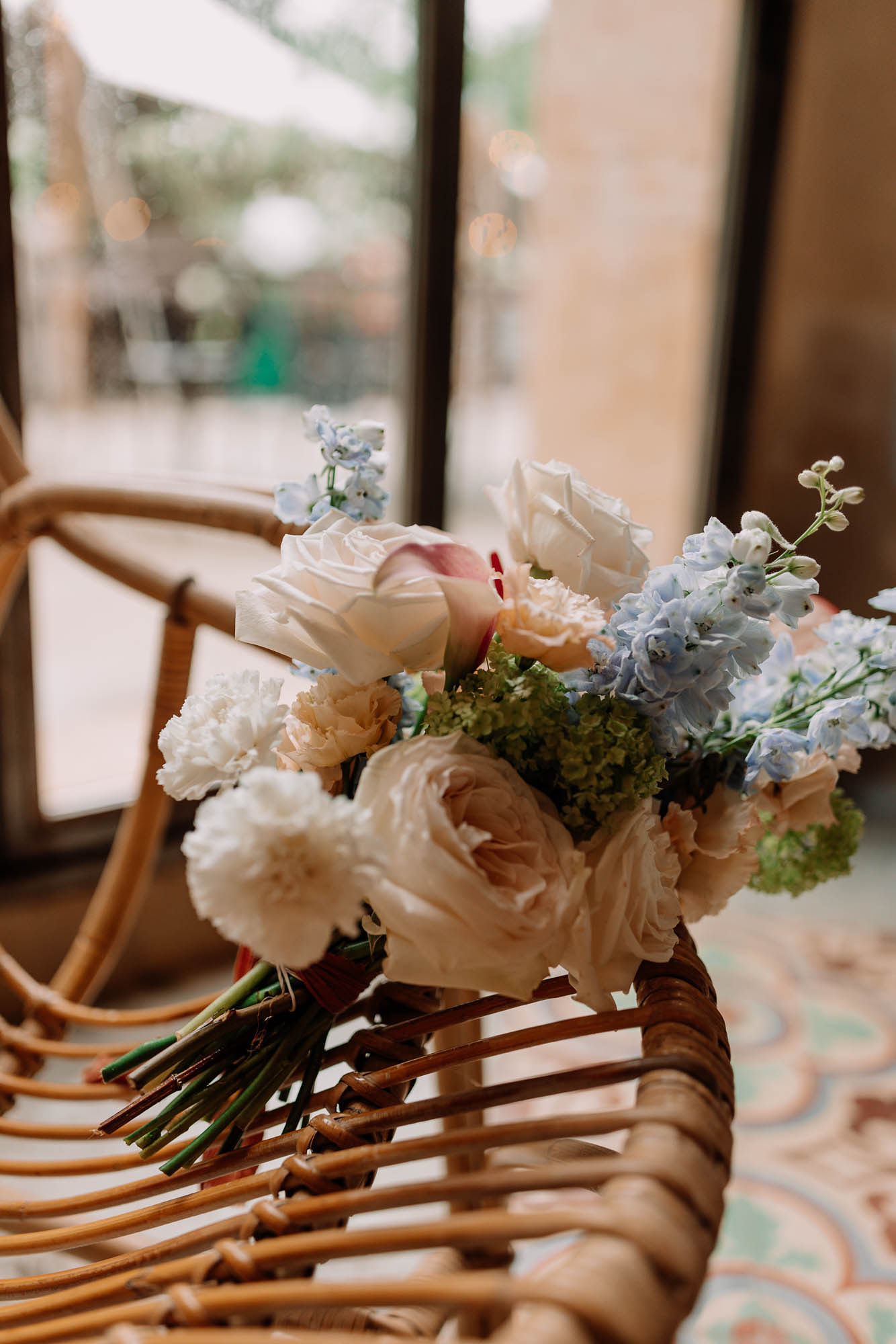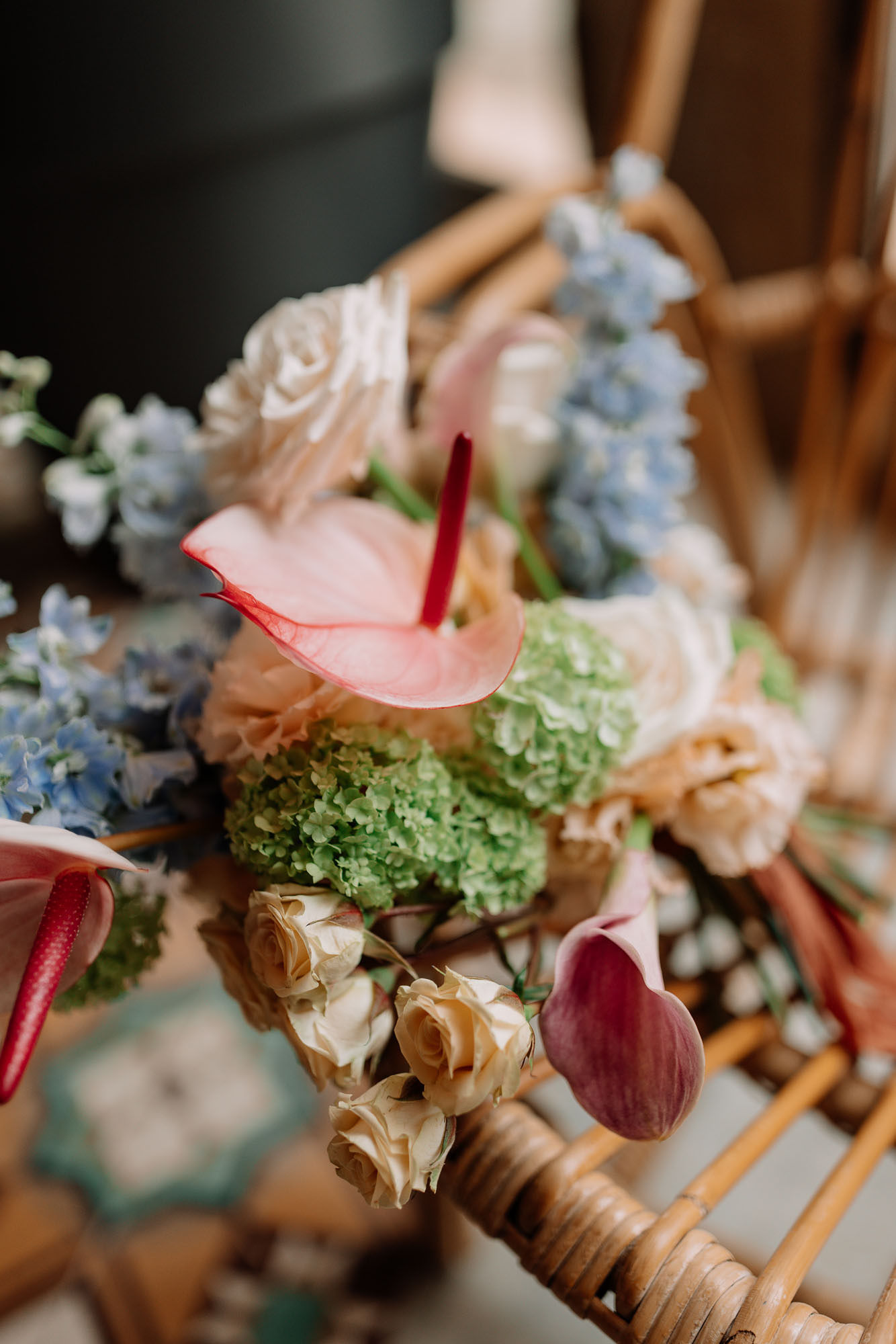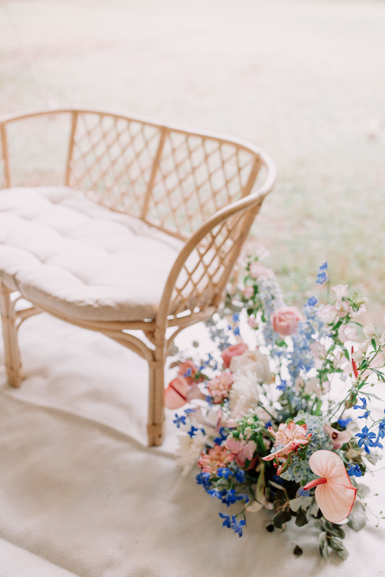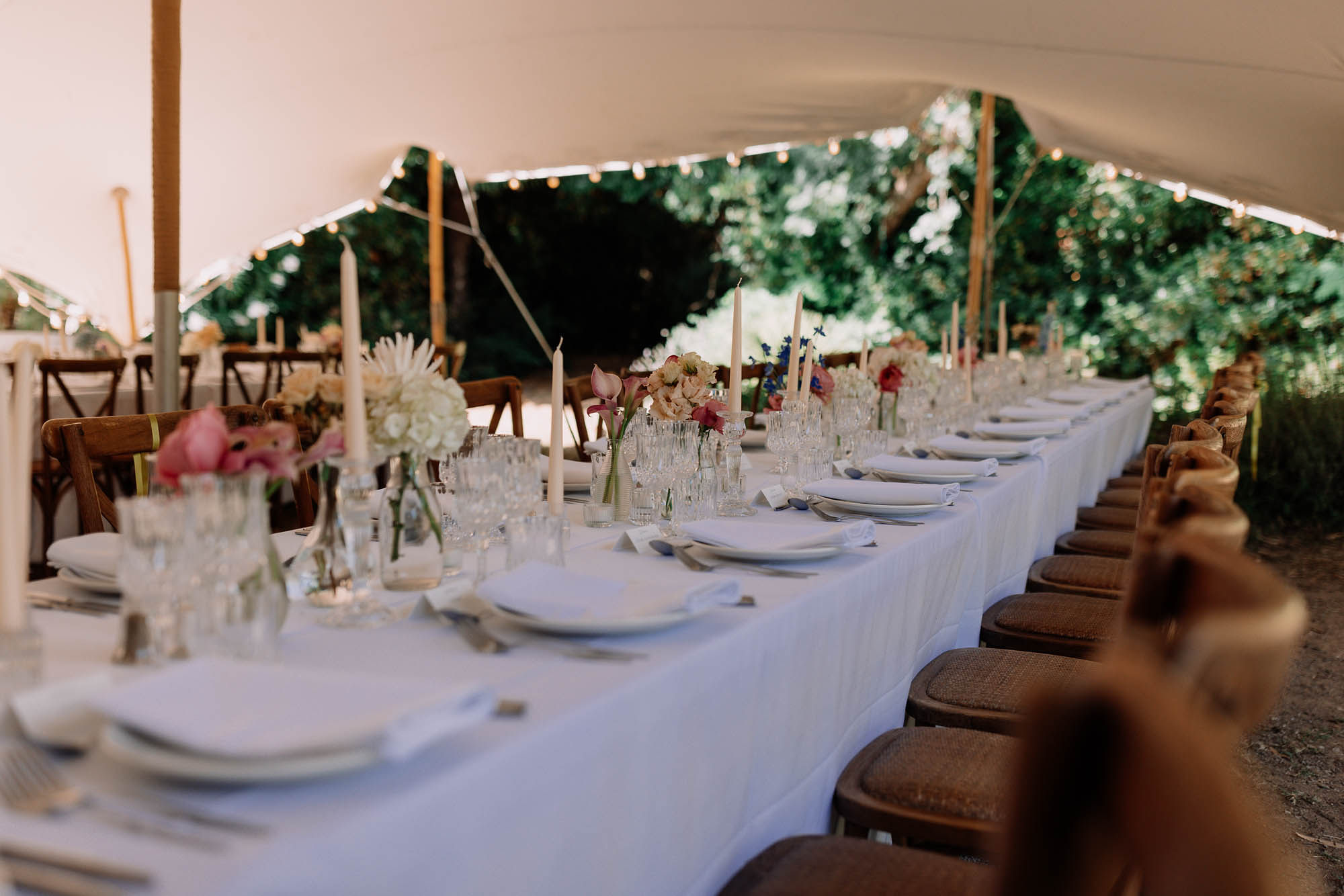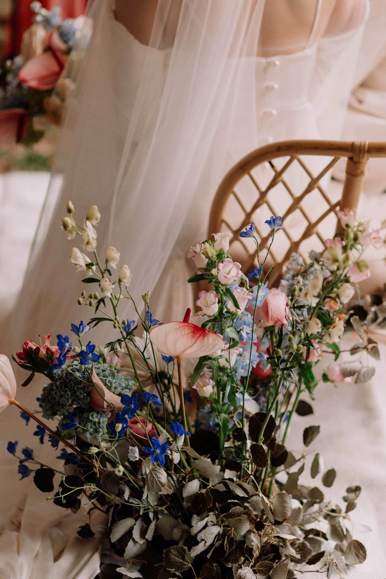 fleuriste Mon Soleil Rose, des fleurs locales et de saison. Les couleurs pastels des compositions florales apportaient la touche romantique au décor. Accumulation de petits vases vintage sur les tables, composition dans l’allée de la cérémonie… Dans une ambiance intimiste, le mobilier de